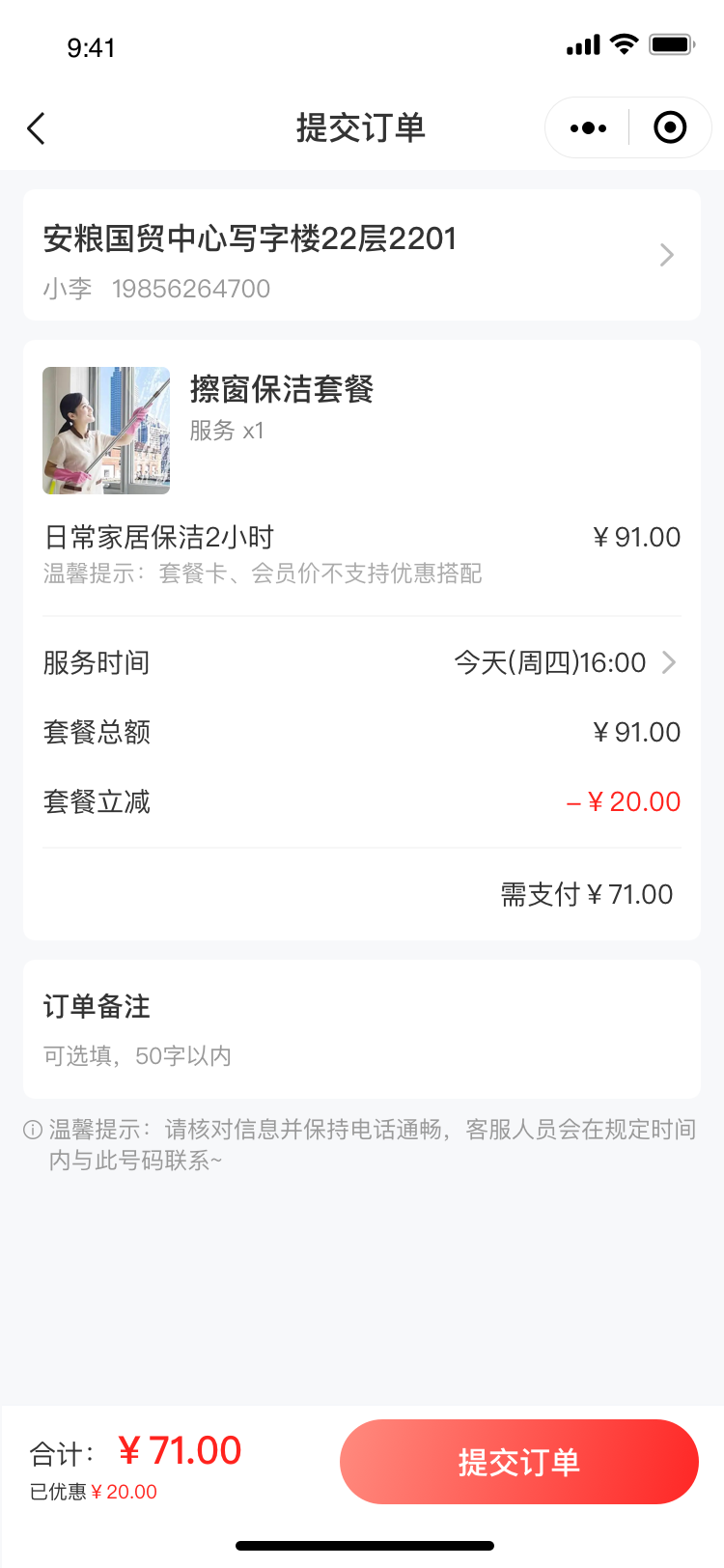 预约时间后,系统会自动生成一份 “订单确认单”,清晰罗列核心信息:服务项目、服务时间、服务地址(需用户补充门牌号、小区名称,部分系统支持定位自动填充)、费用明细(服务费、是否含耗材费、优惠抵扣金额等)、预计服务时长与服务人员数量。用户可逐一项核对,若需修改(,可直接在订单页编辑;确认无误后,点击 “提交订单” 并完成支付,订单即正式生效。
