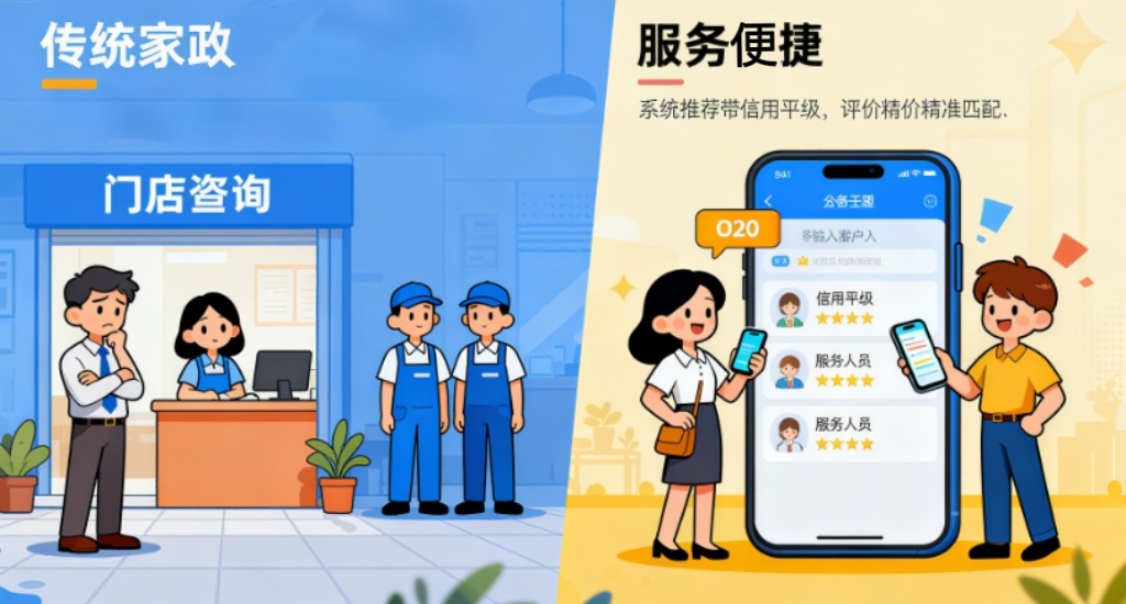 随着互联网技术的迅猛发展,O2O模式逐渐渗透到各行各业,家政服务行业也不例外。近年来,通过手机App、小程序等数字化工具,将用户与家政服务人员高效连接,那它和传统家政模式有什么不一样呢?