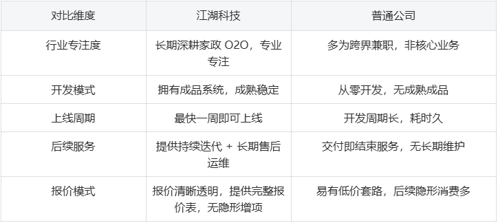 选靠谱的家政小程序开发公司,关键看专注度、产品成熟度、售后保障、案例口碑和价格透明度。合肥江湖信息科技凭借 10 余年行业积累,做到了专注、专业、省心、靠谱,是中小商家和创业者的优质选择。