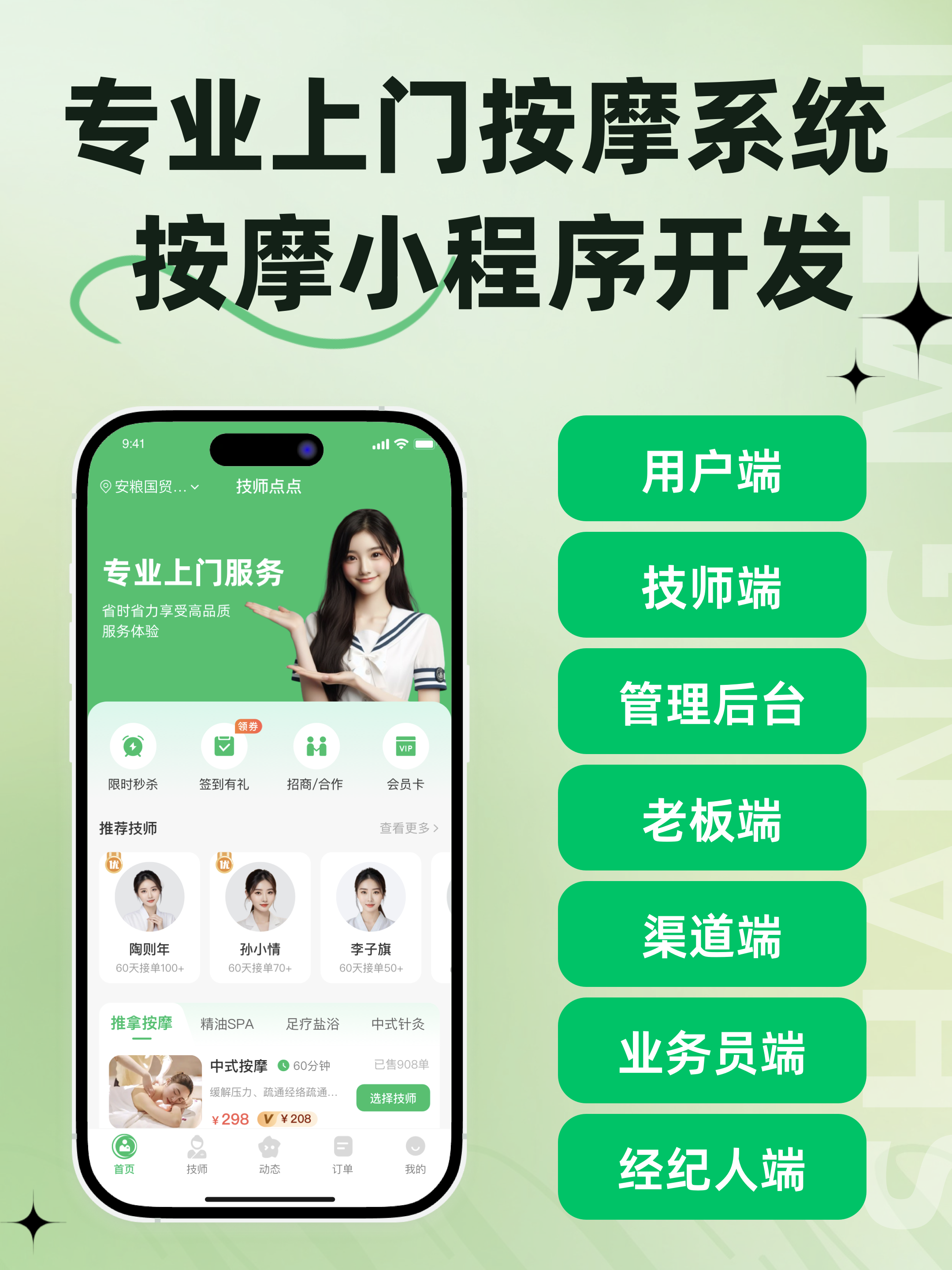 一眨眼已经到2025年,技师点点上门按摩系统也已经迭代更新出了一长串的端口列表:用户端、服务端、老板端、渠道端、业务员端、经纪人端、管理后台、商家后台……乍一看,不免让人有些眼花缭乱。一个看似简单的上门按摩平台怎么会需要如此多的端口,他们的用处是什么呢?今天就来为大家介绍一下。