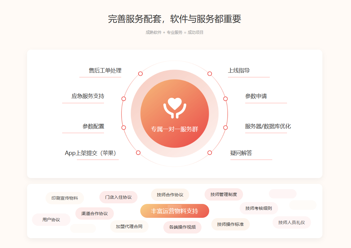 核心功能也是完全能打,基础的预约下单、智能派单这些不用说,会员储值、优惠券、分销推广这些营销工具都自带,支持多城市运营和加盟模式,后续想拓展规模也不用换系统。而且维护售后很省心,没有隐形年费,7X12个小时售后保障,BUG响应修复也快,不会因为系统问题掉订单。