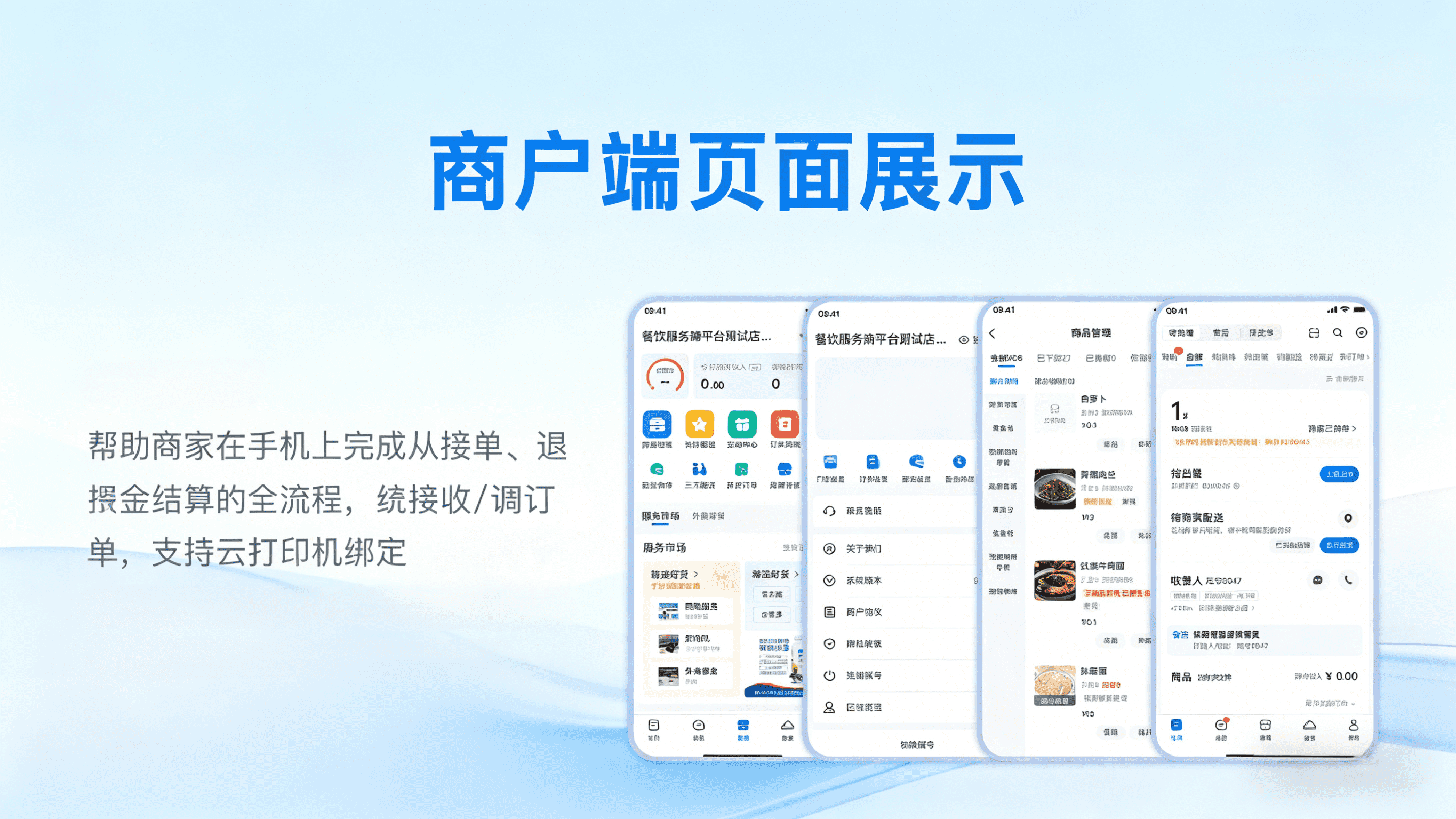 核心功能:菜品管理、接单、订单处理、营业数据、营销活动设置。