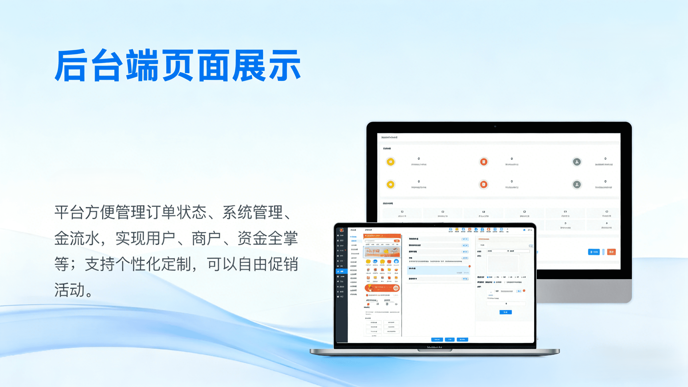 核心功能:商家审核、订单管理、骑手管理、营销配置、财务分账、数据统计。