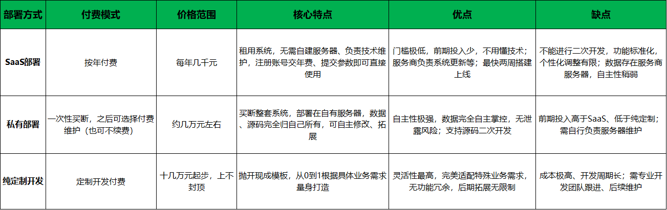 这里给大家一个小建议:90%的中小创业者,前期选SaaS部署就足够了,性价比最高、风险最低,等业务做起来了,再升级也不晚,不用一开始就花大价钱买私有部署或定制开发,避免资金浪费。