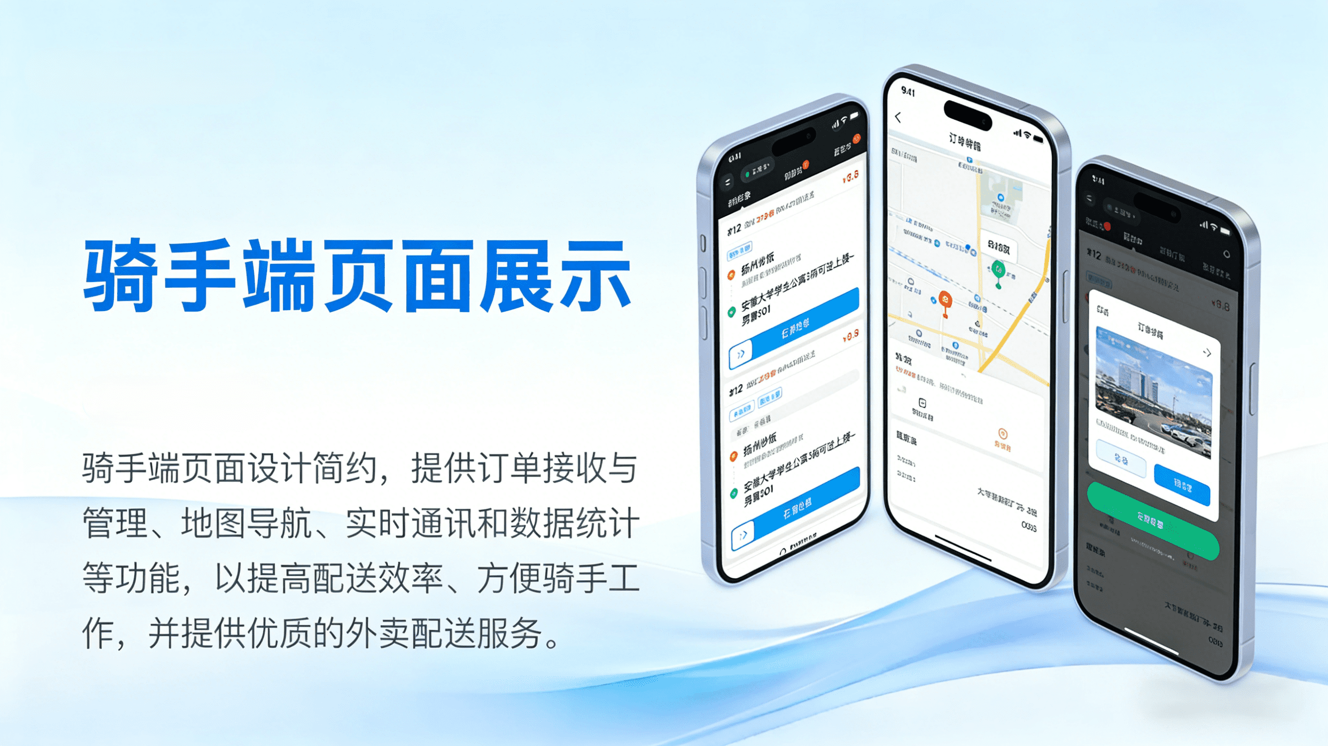 核心功能:抢单 / 派单、导航配送、订单状态更新、收益结算。