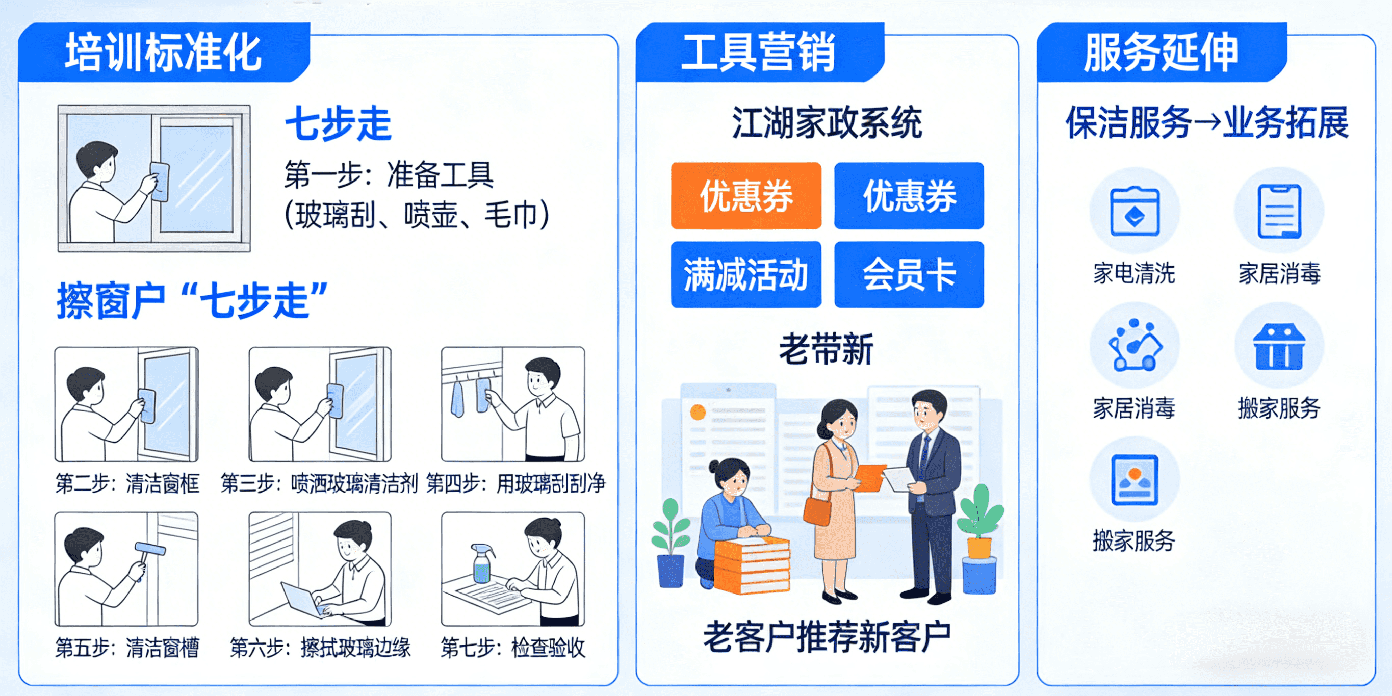· 培训标准化: 哪怕是擦窗户,也要制定“七步走”的标准,让用户感受到专业。