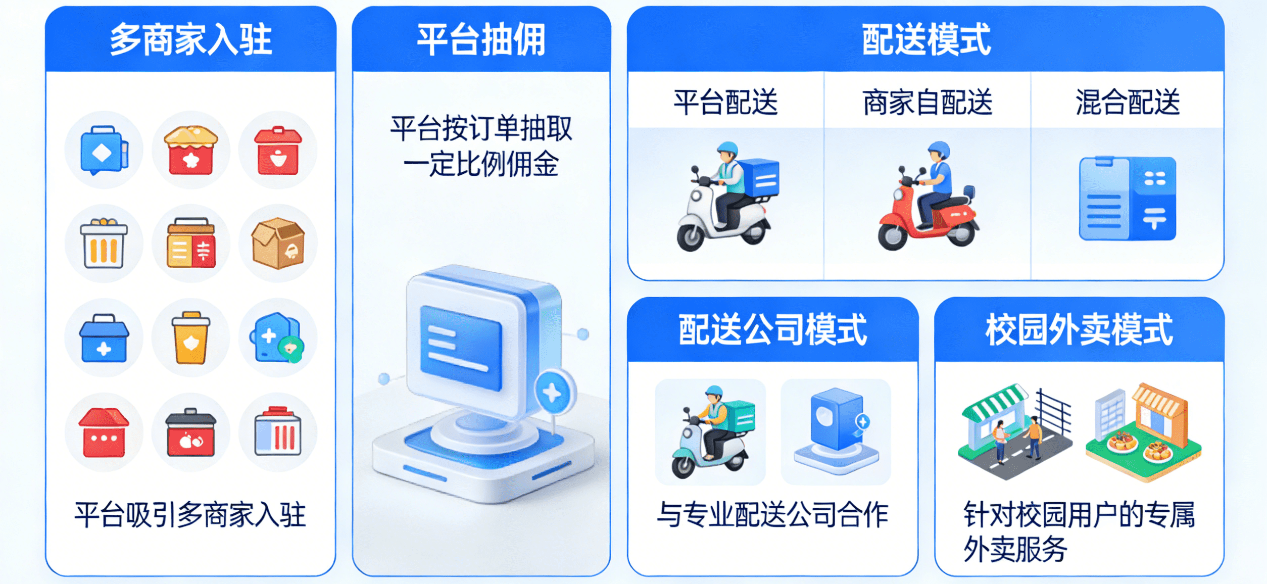 多商家入驻、用户在线下单支付、商家接单出餐、骑手实时接单配送、平台智能订单调度、抽佣与财务结算、营销活动与会员体系、多区域 / 多分站管理等复杂环节。