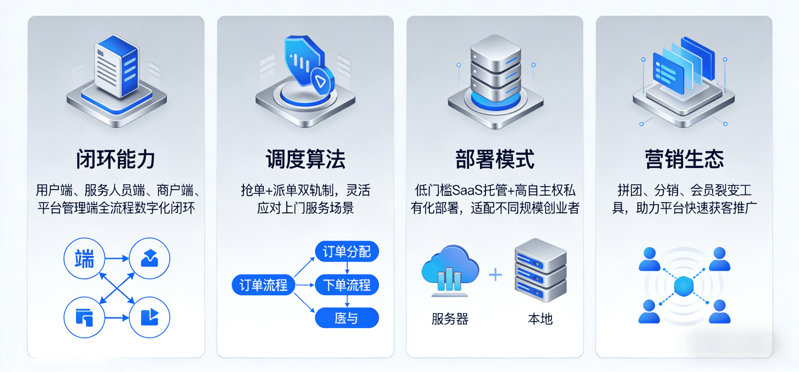 · 闭环能力:可完美打通用户端、服务人员端、商户端和平台管理端,实现全流程数字化闭环;