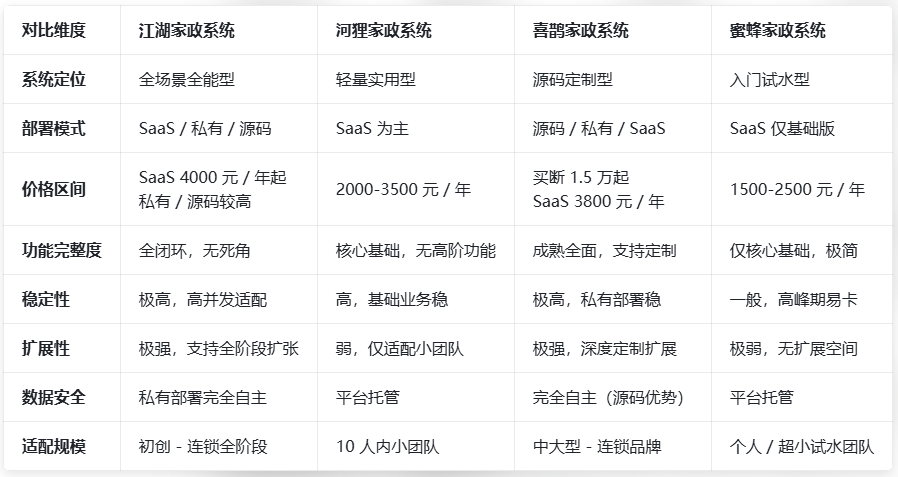 - 初创小团队、预算有限、想长期做 → 选江湖家政系统 SaaS 版:功能全、稳定、售后强,4000 元 / 年一步到位,后期扩张不用换系统,性价比最高。