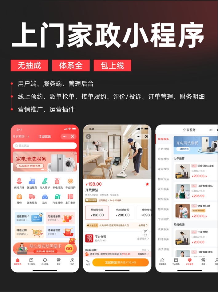 (2)选择SaaS部署方式,搭建家政小程序,拒绝迷恋APP。上门家政创业,线上平台是核心,但新手无需盲目投入资金开发APP——APP开发成本高(动辄几万、几十万),后期营销推广投入大,且用户下载、注册门槛高,不利于前期获客。对于新手来说,最性价比的选择是用SaaS部署方式搭建家政小程序,SaaS模式无需专业技术团队,依托成熟的系统模板,一键部署,成本低、上线快,最快7天就能投入使用。选择合适的家政系统,例如江湖家政系统,其SaaS部署模式不仅成本可控,还涵盖用户端、服务人员端、管理后台三大核心模块,支持在线下单、订单管理、服务派单等全流程功能,完美适配上门家政创业的前期需求,让新手无需担心技术问题,专注做好运营。