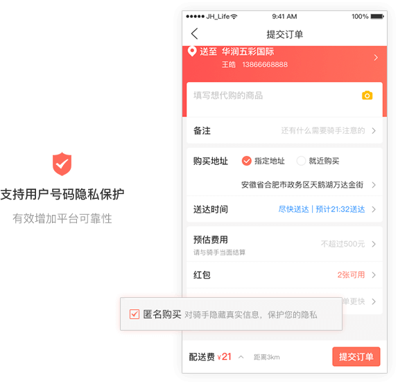 在订单流程、信息交互等环节中、会对用户个人信息进行加密或者隐藏处理,避免出现隐私泄露。