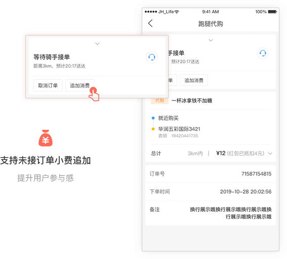 灵活打赏功能,未接单钱可以追加消费;服务完后,用户觉得骑手服务好,随时能给小费,也能提高骑手的积极性,形成良性循环。