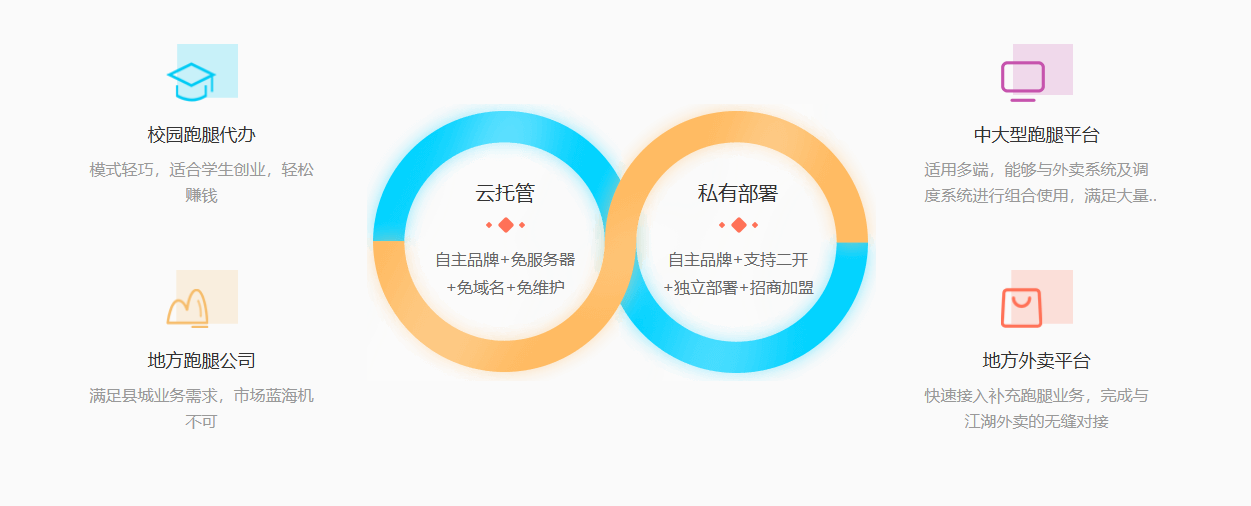 而且部署方式也灵活,支持云托管和私有化部署两种方式,云托管适合预算没那么高的,快试水的创业者,不用自己买服务器、域名,也不用自己维护,全都可以交给服务商,也就是江湖科技来,自己只用专心运营就可以;而私有化部署则更适合长期运营的、预算充足的创业者,可以打造自己的品牌,还可以招商加盟。