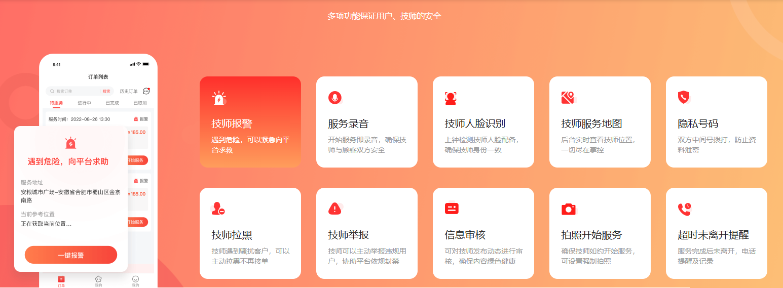 对于上门行业,最注重的就是平台声誉问题,与之直接相关的就是技师安全问题,技师点点为此针对性开发出多种功能。