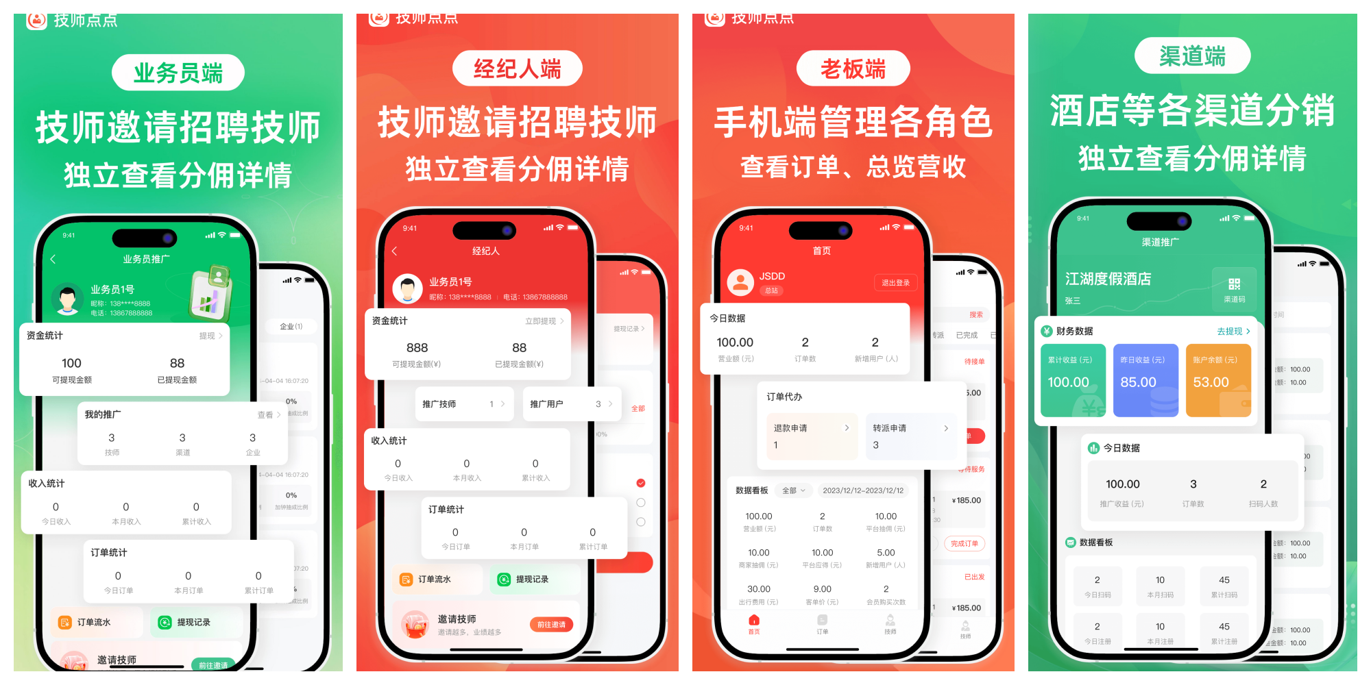 ● 技师:技师可灵活接单、管理日程;优秀技师可发展为经纪人,组建团队,获得管理收益。