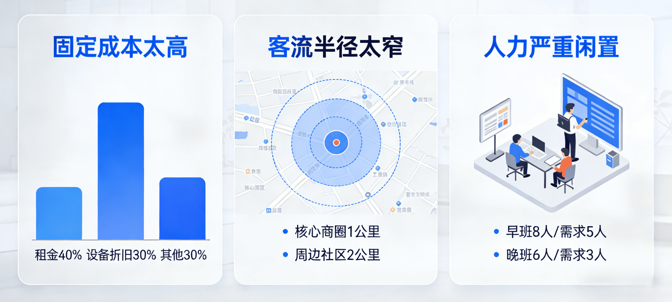 · 客流半径太窄:只能做附近居民、上班族的生意,不会做线上引流,老客留不住,新客进不来。