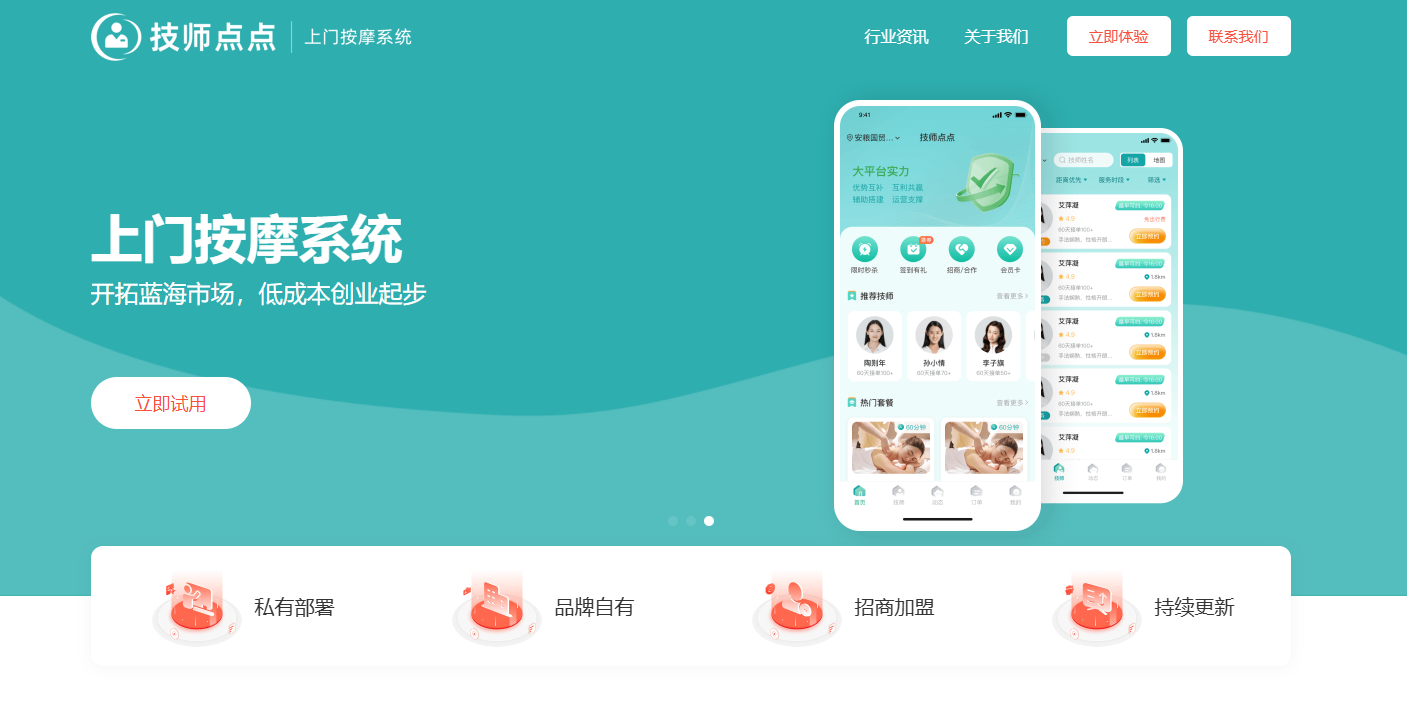 核心产品之一的技师点点上门按摩系统,更是精准匹配了上门按摩行业的所有场景需求:
