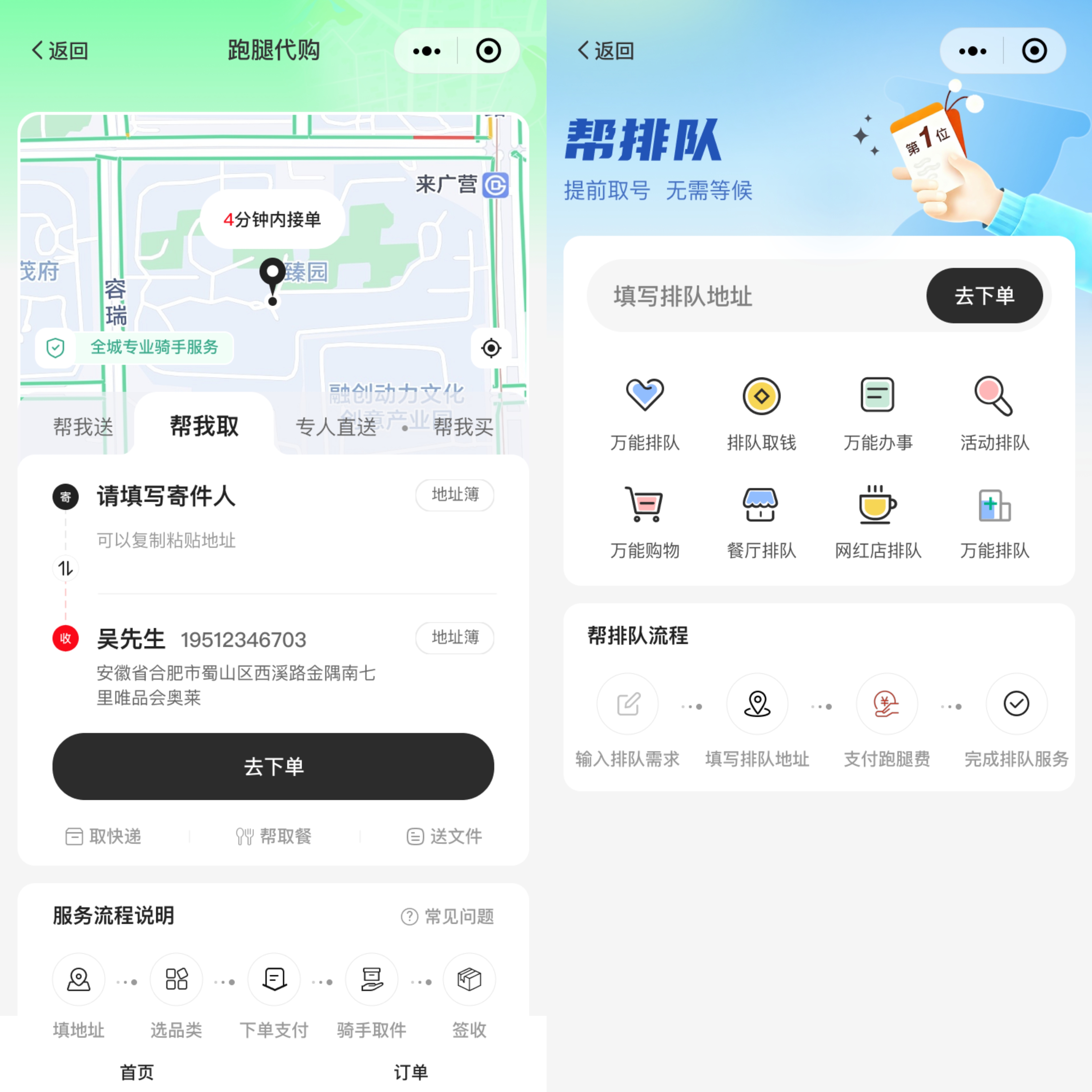 当然,现在的跑腿不局限于传统的代买、代送这些,而是覆盖全场景的同城代办服务,服务对象包括个人用户、小微企业、商户等。
