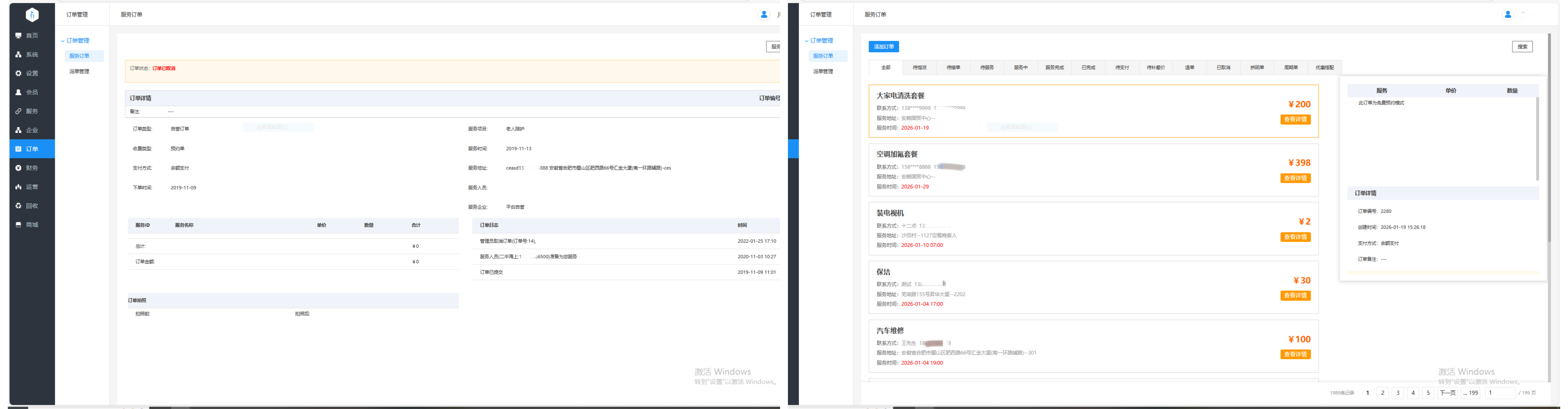 后台全订单管理、服务历史记录