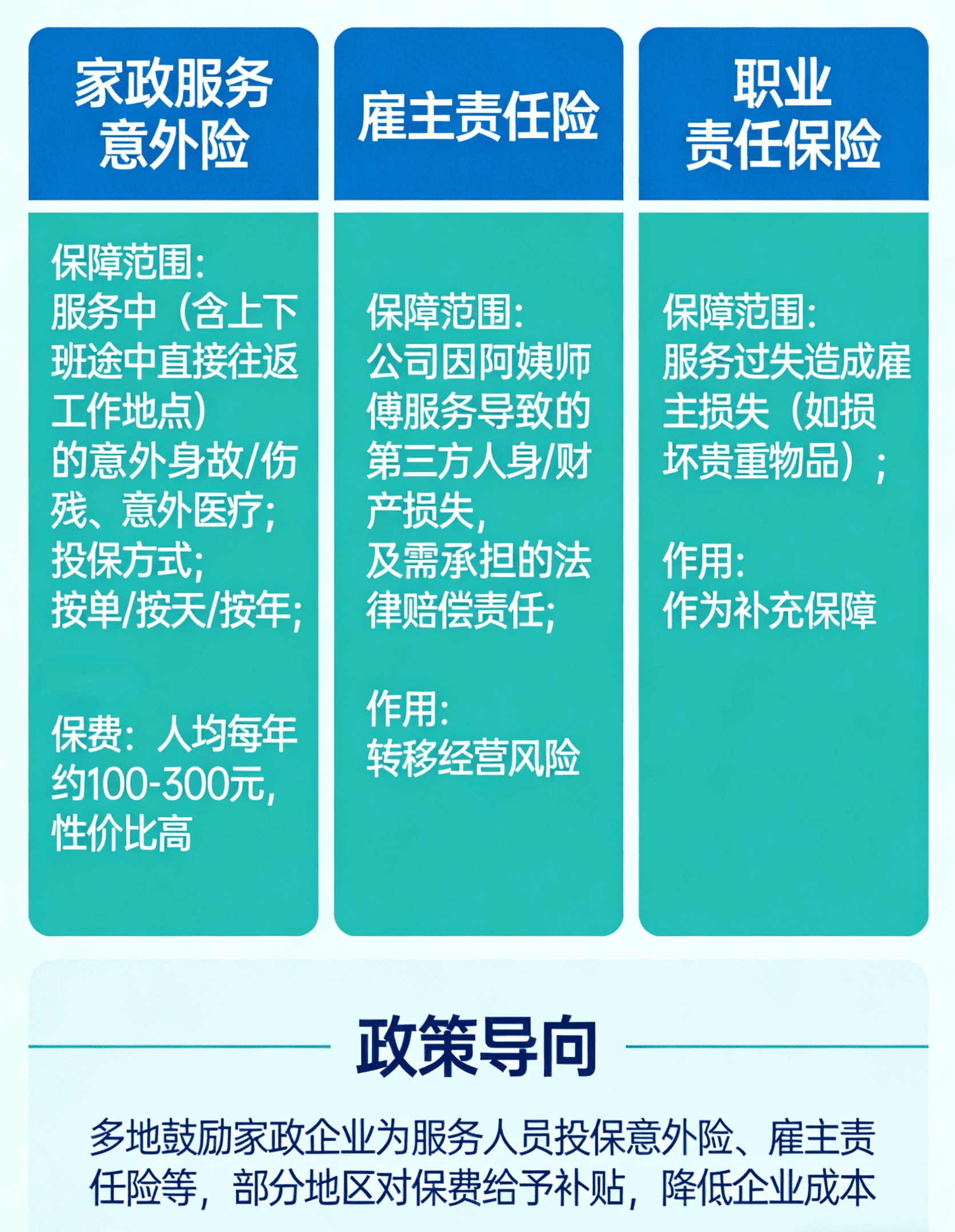 · 政策导向:多地鼓励家政企业为服务人员投保意外险、雇主责任险等,部分地区还对相关保费给予补贴,能降低企业成本、