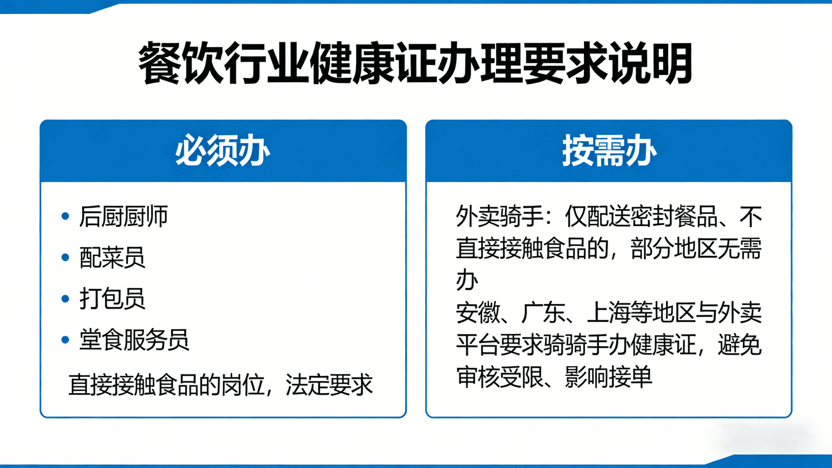 外卖骑手的话,如果仅负责配送密封餐品、不直接接触食品的,按《网络餐饮服务食品安全监督管理办法》,部分地区明确无需办健康证;