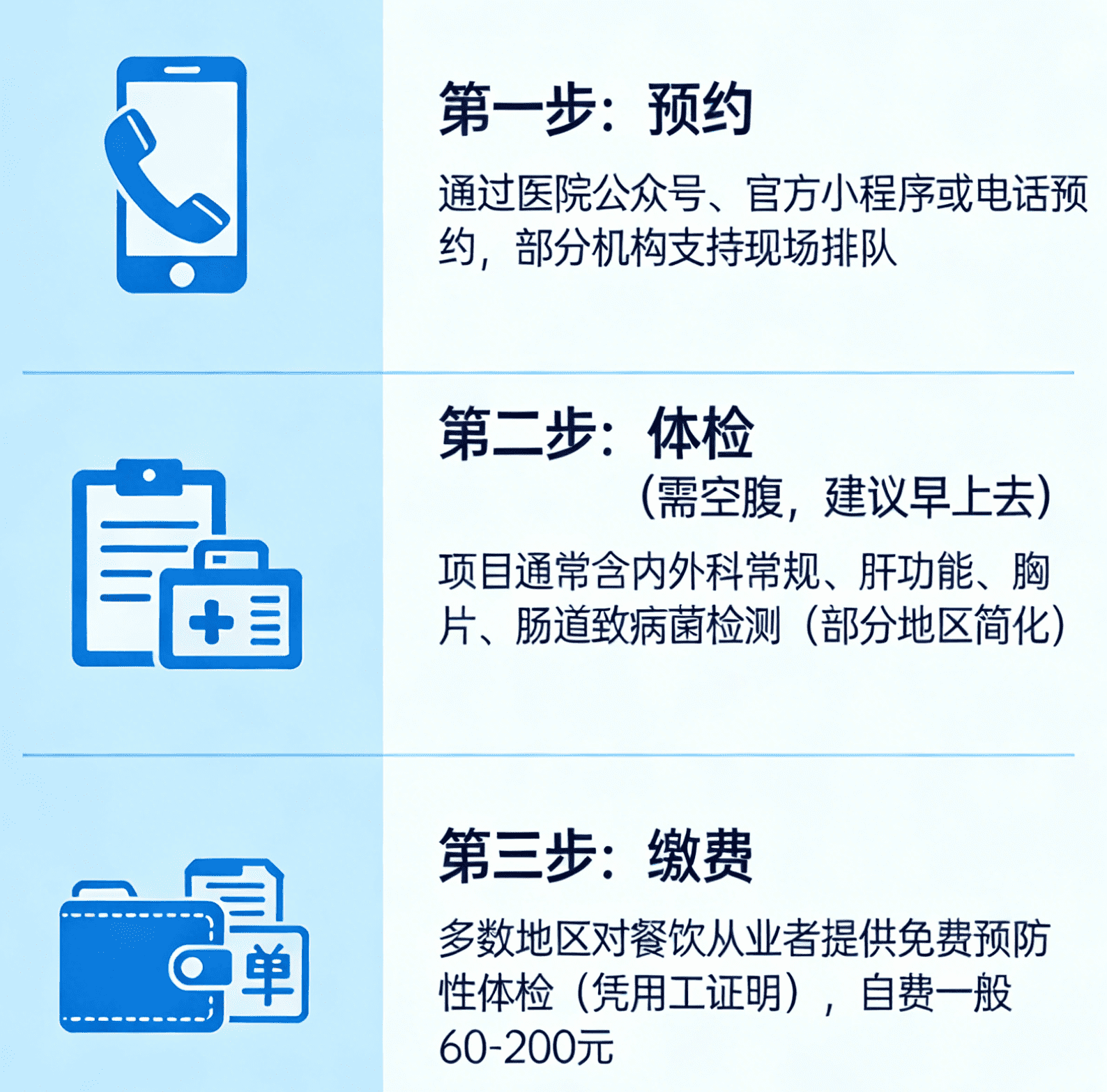 ③ 缴费:多数地区对餐饮从业者提供免费预防性体检(凭用工证明),自费一般 60-200 元