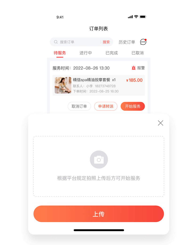 系统可以设置“强制拍照”功能,技师到达服务地点、准备开始服务、服务完成后,都要拍照上传平台,一方面能确保技师真的按时履约,不出现“挂单”“代服务”的情况,另一方面也能让平台掌握技师的服务状态,万一有异常能及时发现。