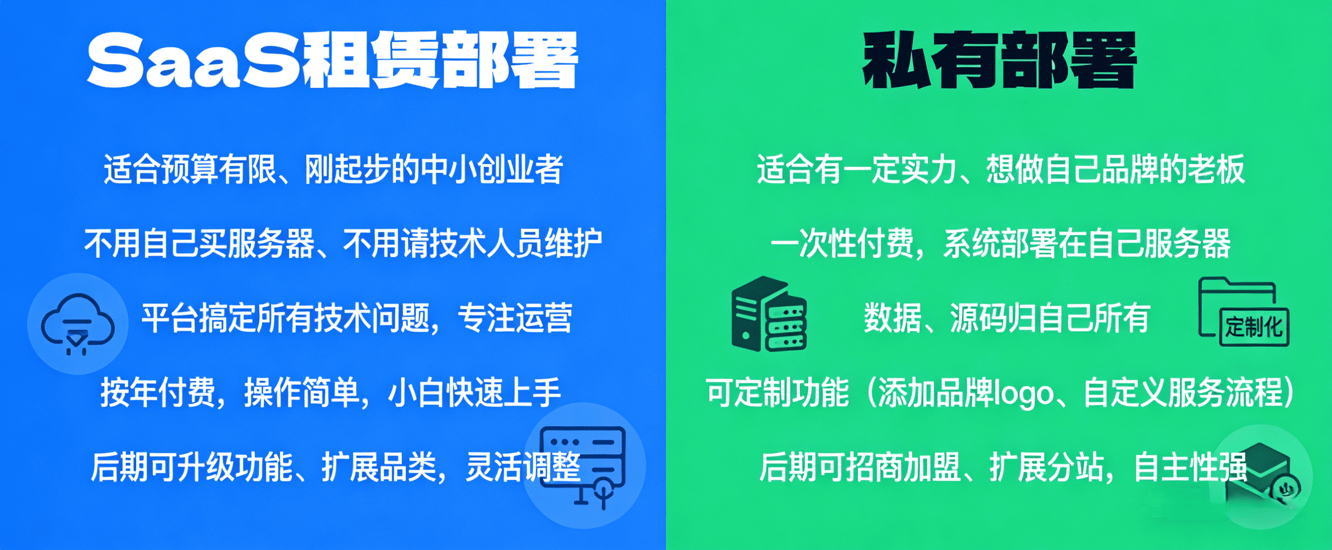 · 私有部署:适合有一定实力、想做自己品牌的老板,一次性付费,系统会部署在你自己的服务器上,所有的数据、源码都归你自己所有,还能根据你的需求定制功能,比如添加自己的品牌logo、自定义服务流程,后期想做招商加盟、扩展分站,也有足够的空间,自主性更强。