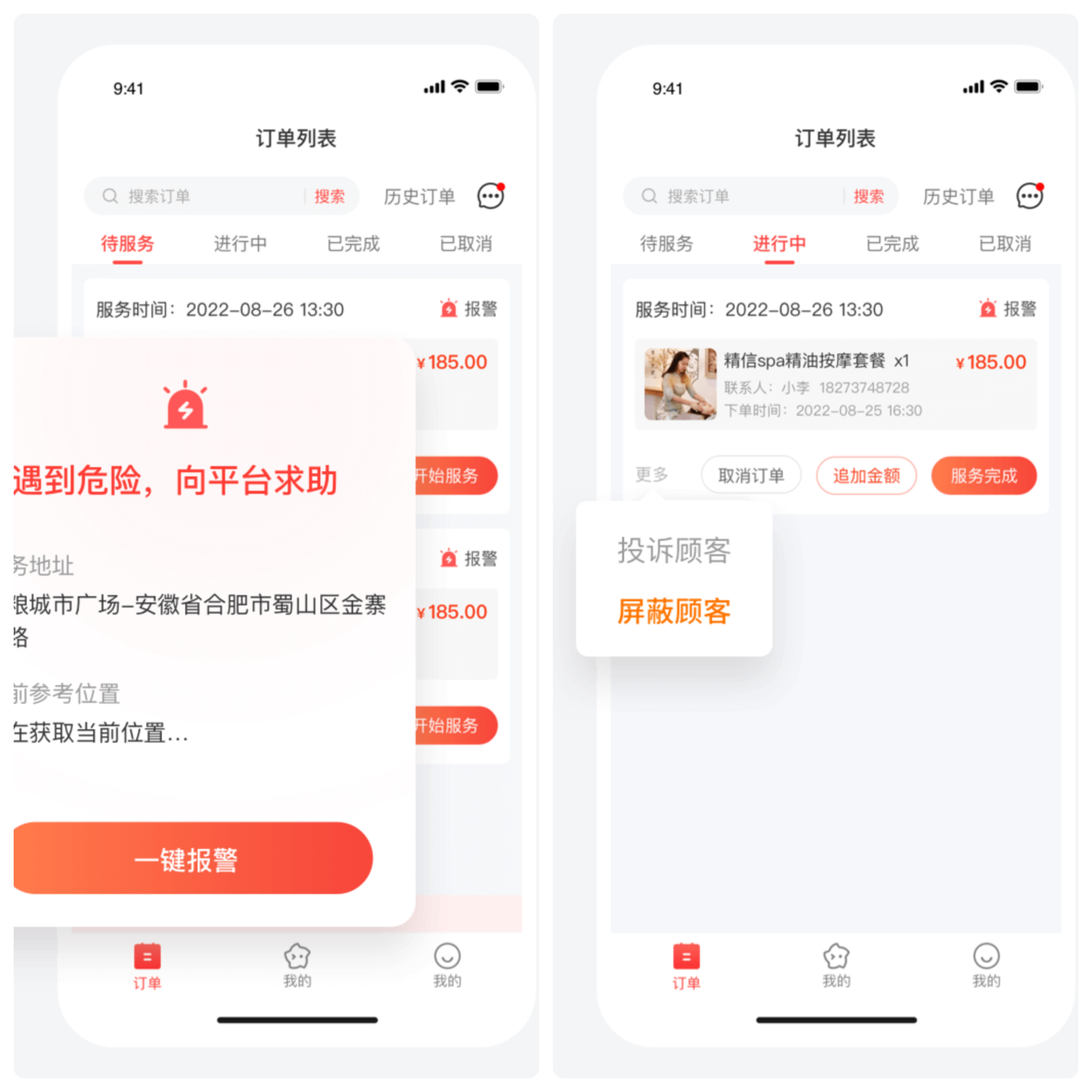 技师在服务中如果遇到骚扰、无理要求,或者感觉有危险,能直接在系统上点击紧急报警,平台管理员会第一时间收到提醒,介入处理;要是遇到难缠、恶意的客户,还能直接拉黑,以后再也不接这个客户的订单,也能发起举报,协助平台封禁违规用户,从根源上避免二次侵害。