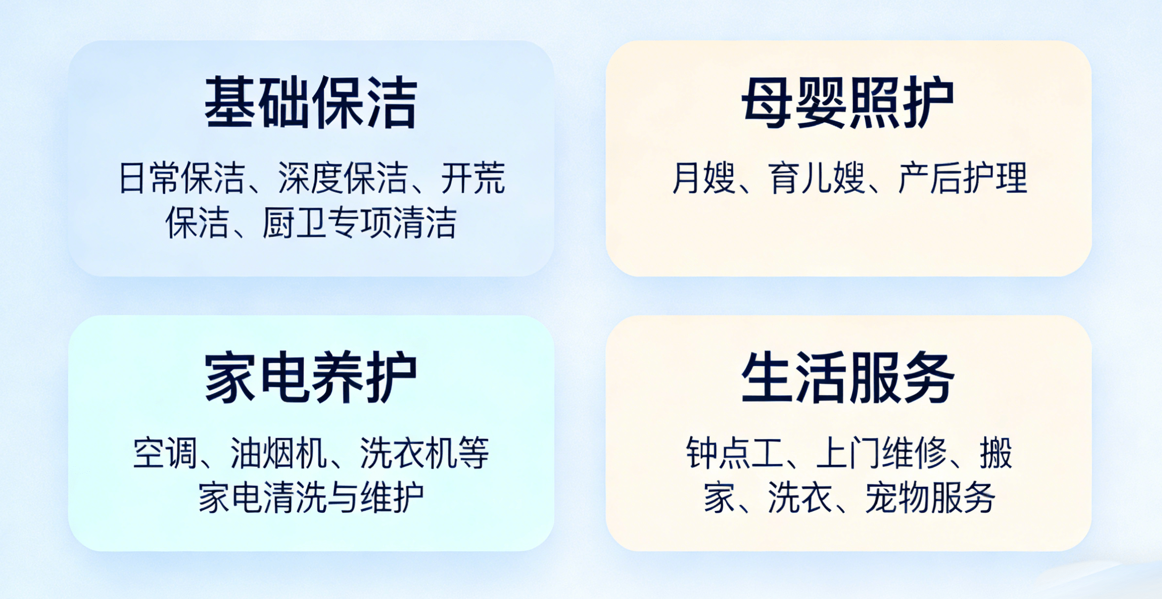 支持全品类上门家政业务,一站式满足家庭与生活服务需求:
