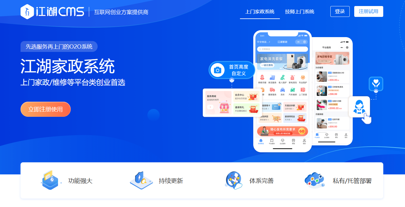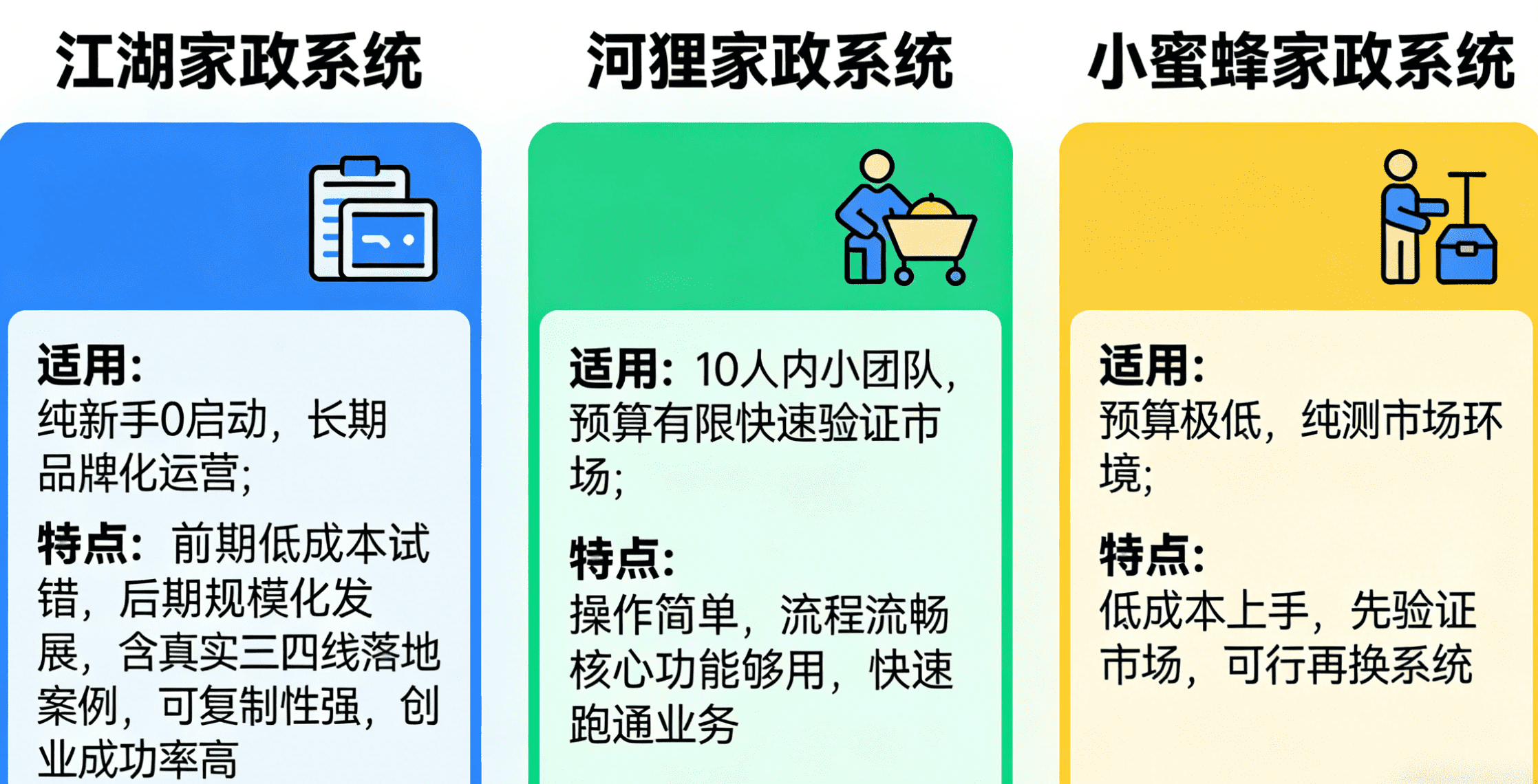 · 纯新手从 0 启动,还想长期做品牌化运营:直接选江湖家政系统,能让你前期低成本试错,后期规模化发展,还有真实的三四线落地案例,可复制性强,创业成功率更高;