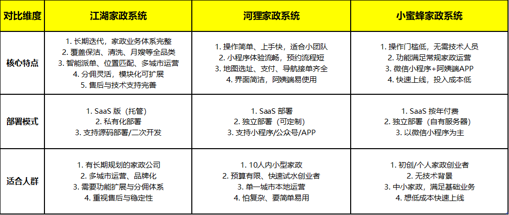 今天就把市面上最常被家政创业者提起的 3套系统 —— 江湖家政系统、河狸家政系统、小蜜蜂家政系统,从特点、支持的部署模式、适配阶段等,跟大家仔细说一下,全是干货,帮想做家政的朋友避坑,选到适配自己现阶段的系统。
