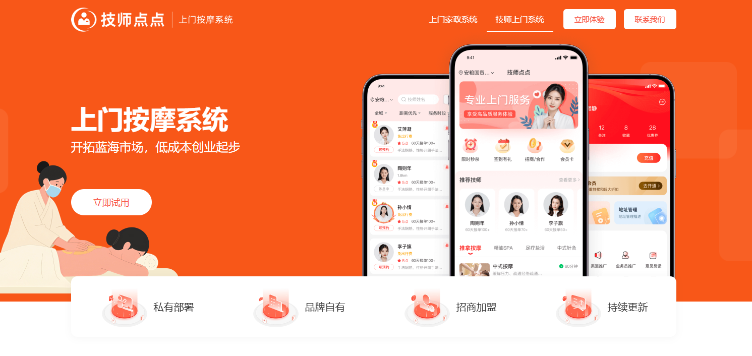 技师点点上门按摩系统,是一个满足 按摩SPA/推拿理疗/足疗艾灸 等不同场景业务需求的一站式O2O预约上门服务系统解决方案。