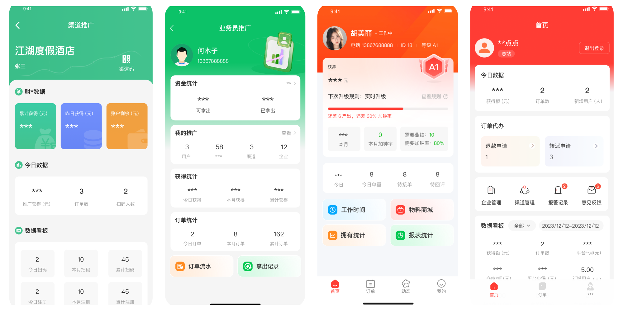 ● 渠道端、业务员端、经纪人端、老板端:覆盖平台全流程。