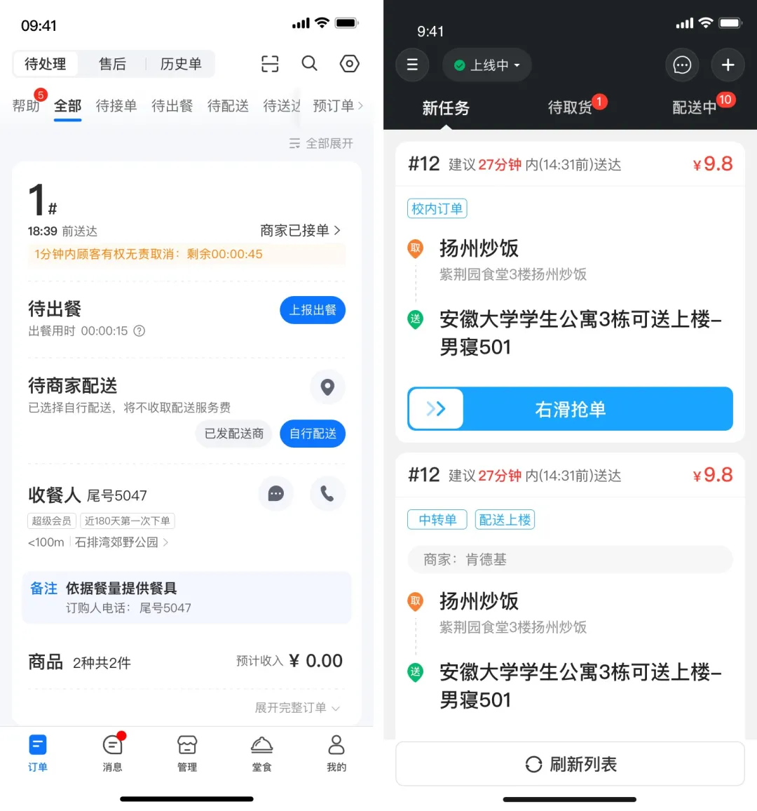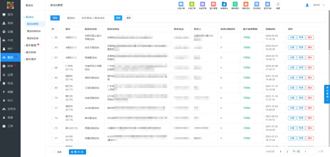(1)菜单重构:后台功能重新归类,如外卖、堂食、自发单、配送、财务等模块独立;配送模块集中管理站点、骑手、考核等。