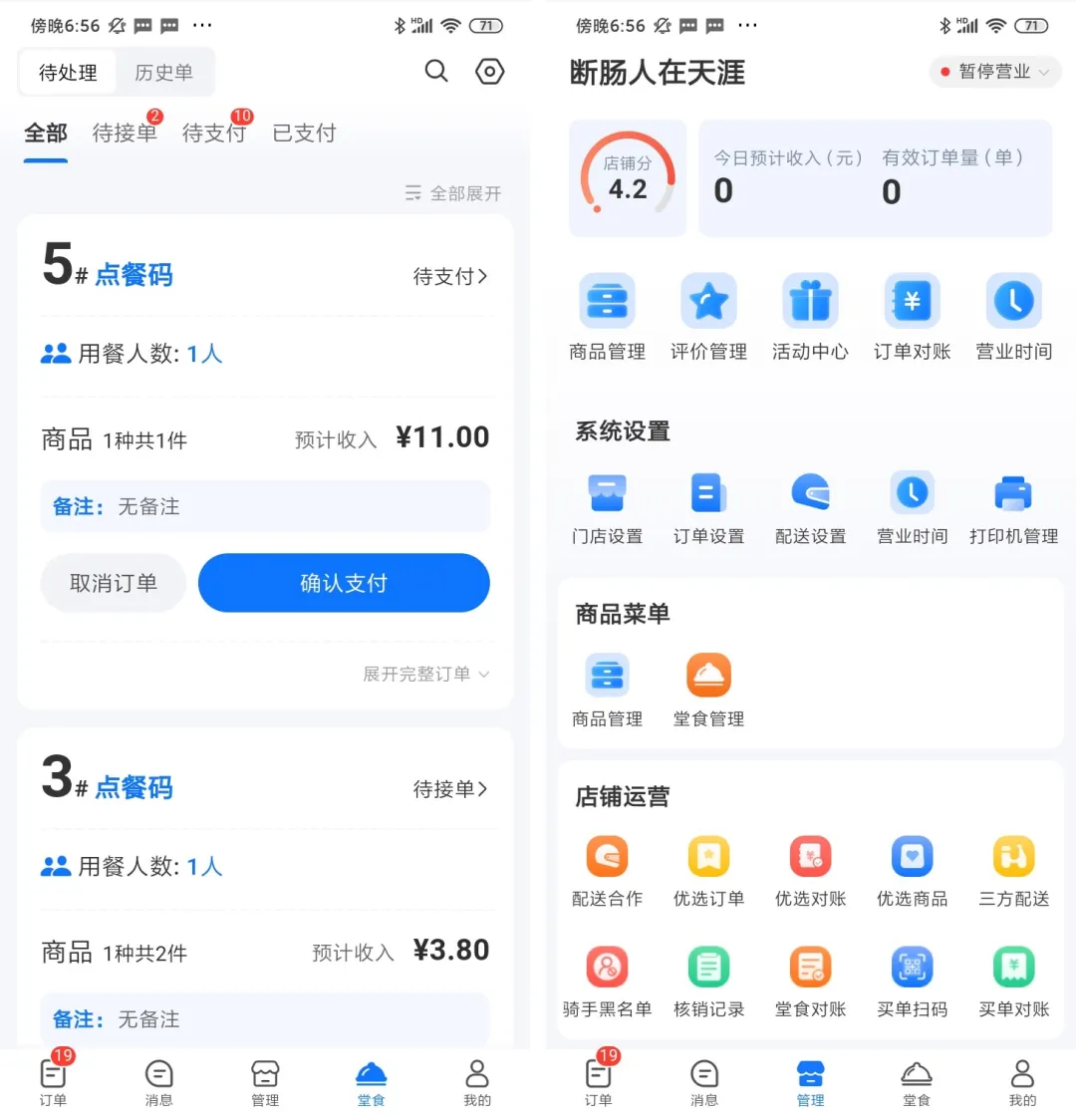 除了上个版本的新的骑手端,本次对商家端进行了重构。知意外卖通系统上,商家将不再需要pc管理后台,一个商家端APP即可实现所有商户端的管理功能。