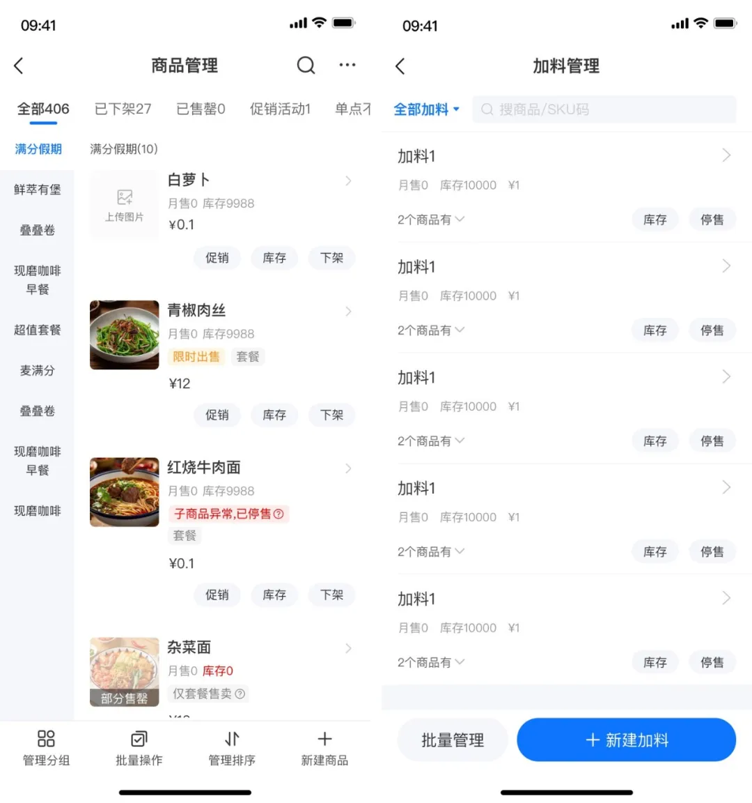 (4)加料与物料管理:加料独立建库,支持跨商品复用(如:奶茶珍珠、卤蛋);加料具备独立库存,售罄后所有关联商品均不可选;引入“主料/辅料”概念,实现菜品因原料缺货自动下架(如牛肉面因牛肉缺货下架)。