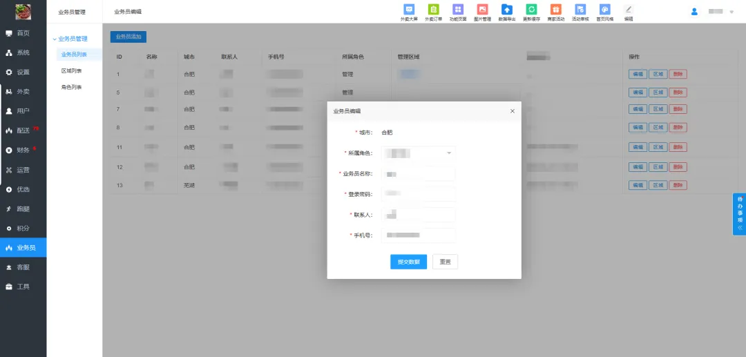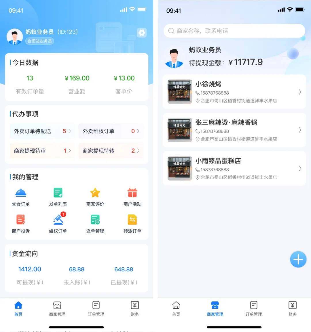 (2)代运营能力:业务员可代商家查看/操作订单(接单、取消、完成)、处理退款、管理活动、查看数据;提现审核等财务操作仍需后台审批,业务员仅可查看。