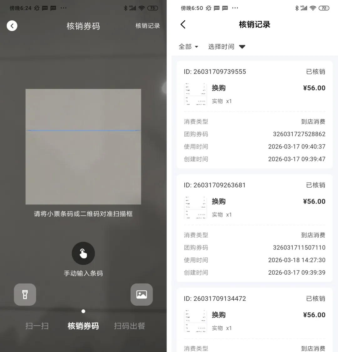 (2)核销记录展示:显示已核销订单的简要信息,如订单编号(如55号单)、金额、核销时间。支持区分团购码、外卖核销码等不同类型。