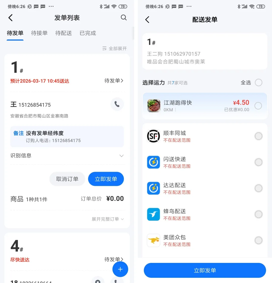 (3)运力选择与不可用提示:若订单无经纬度或超出配送范围,三方平台(如达达)不可用,是否可用有相应说明,提升用户感知。