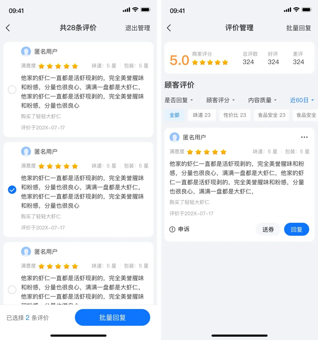 (1)评价管理:新增“送券”功能,用于处理差评协商;支持申诉恶意评论,上传凭证并提交理由;交互样式做了用户友好修改,针对“是否删除”表述不清,改为“是否关闭”,表示对用户不可见。