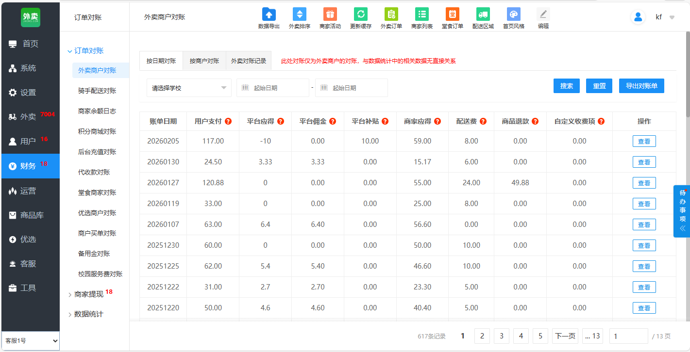 ● 运营后台对账报表:订单、商家、骑手、区域代理等多维结算