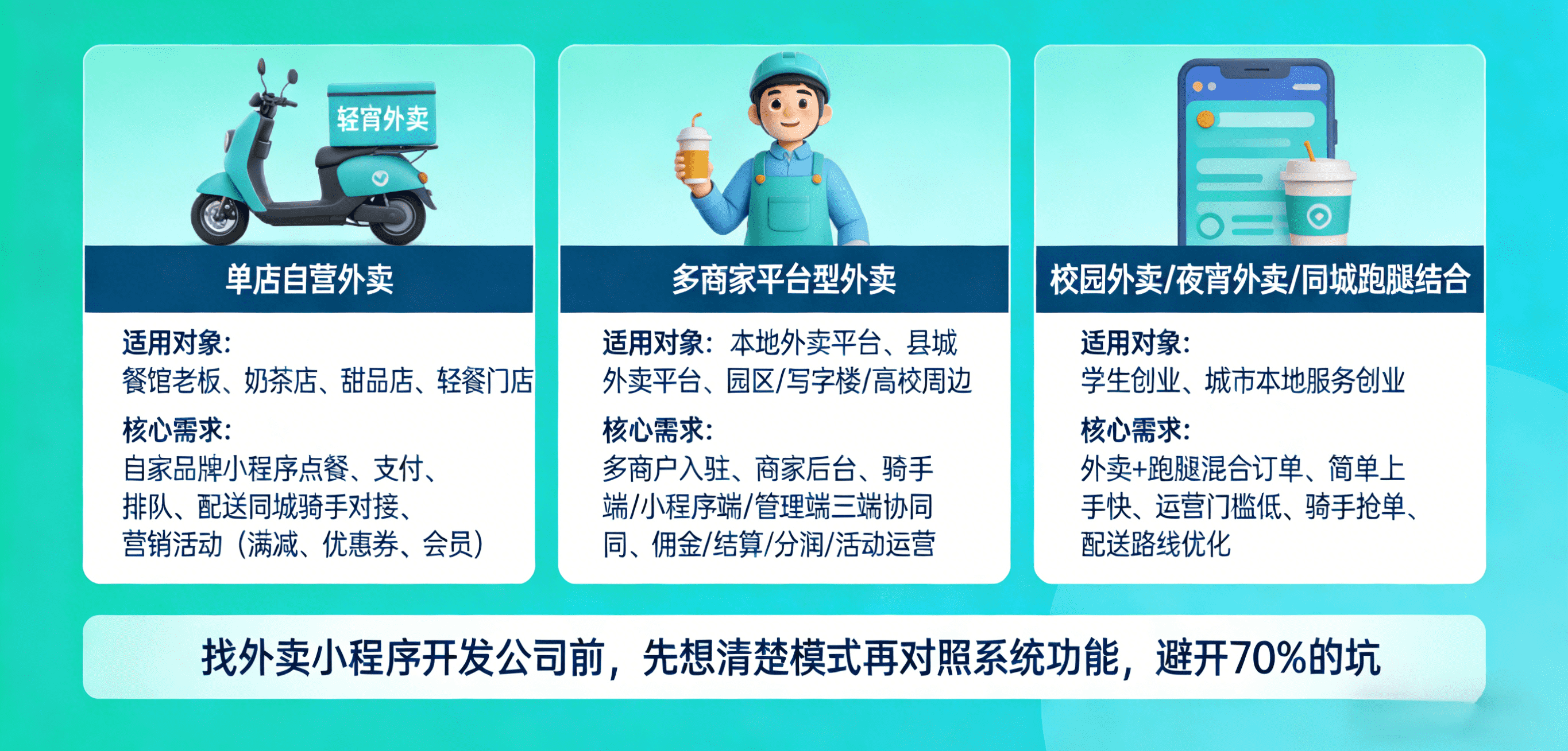 你在找外卖小程序开发公司前,先把自己的模式想清楚,再去对照系统功能,这一步能帮你避开 70% 的坑。