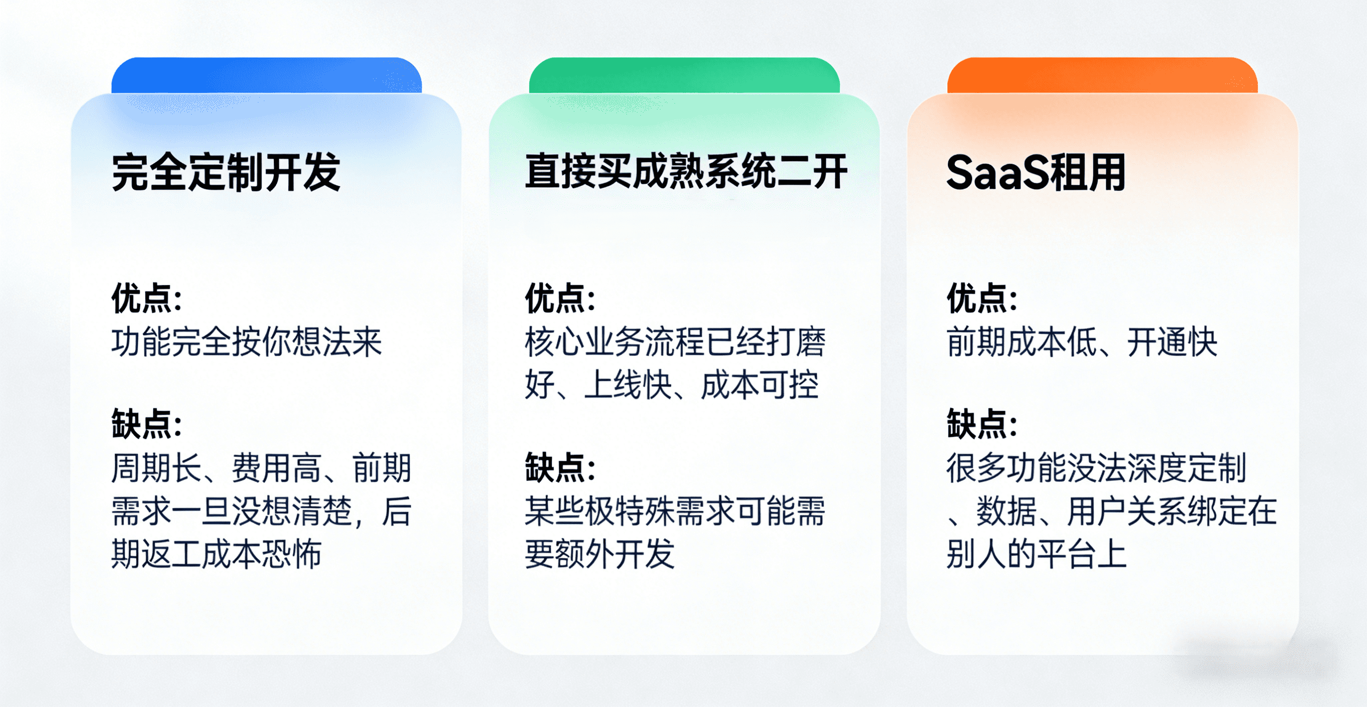 · 缺点:很多功能没法深度定制、数据、用户关系绑定在别人的平台上
