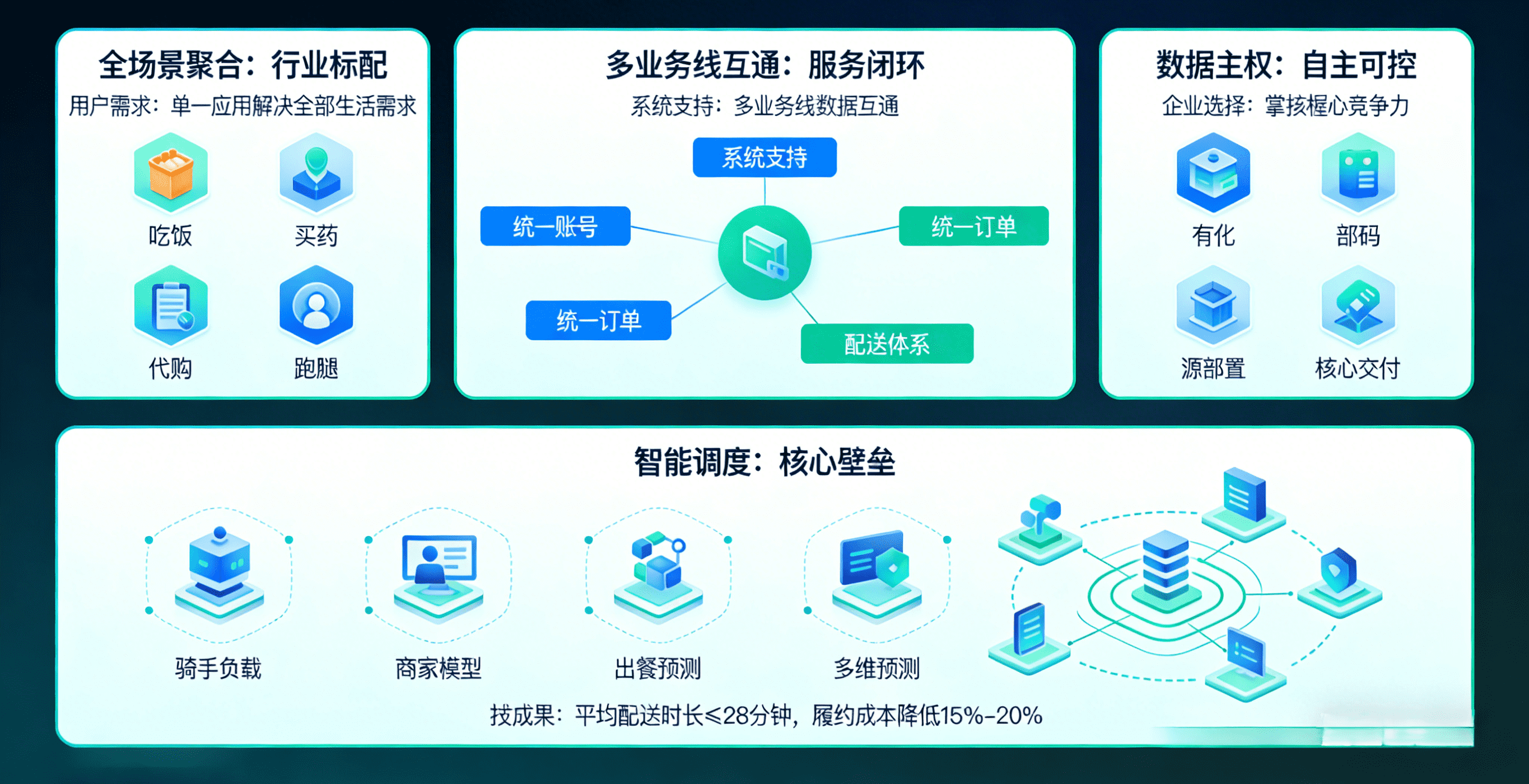 用户已不再满足于单一外卖服务,而是期望在一个应用内解决吃饭、买药、代购、跑腿等全部生活需求。系统必须支持多业务线互通及统一账号、统一订单、统一配送体系,构建 "30 分钟生活圈" 的服务闭环。