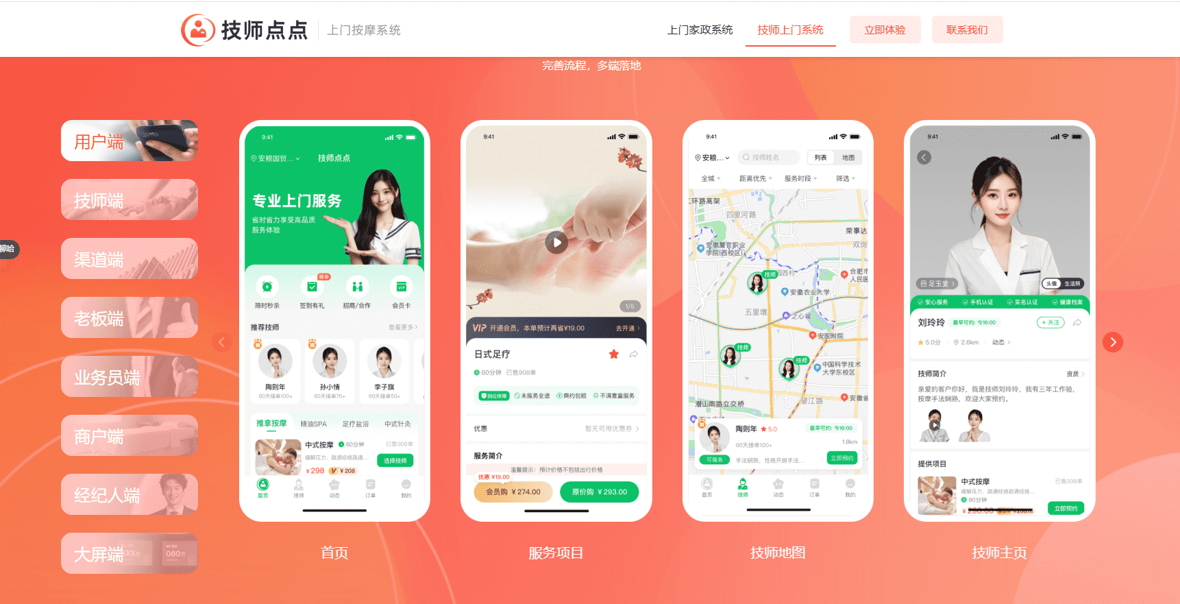 · 用户端(C端体验场):覆盖微信小程序、公众号、APP。支持“先选技师再服务”,提供清晰的技师地图、实名认证信息展示与在线支付评价。