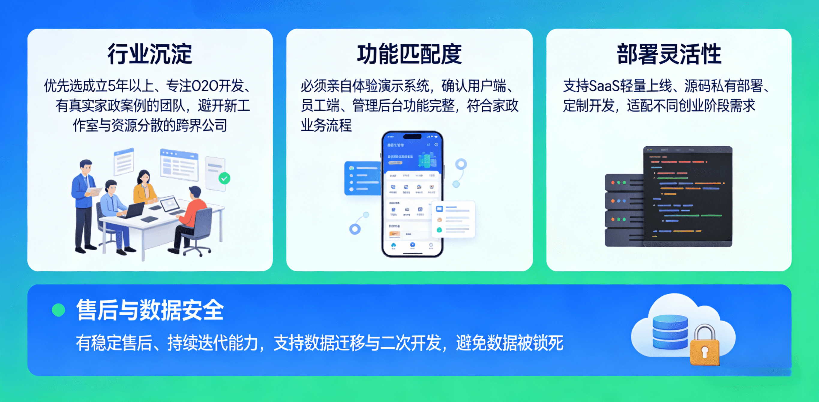 · 看行业沉淀:优先选成立 5 年以上、专注 O2O 开发、有真实家政案例的团队,避开新工作室与资源分散的跨界公司。