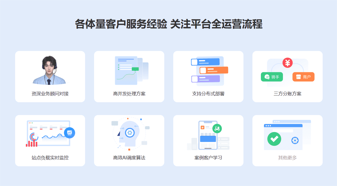 采用成熟的平台级架构,所有系统均为团队从0-1自主研发,拥有多项独立知识产权。支持多端(小程序、APP、H5、PC)统一运行,具备较强的高并发处理能力。系统内置订单调度中心、骑手管理、分站管理等模块,支持对接美团、饿了么、麦芽田等多第三方平台API,能够应对高峰订单压力,适配城市级或县域级平台运营。
