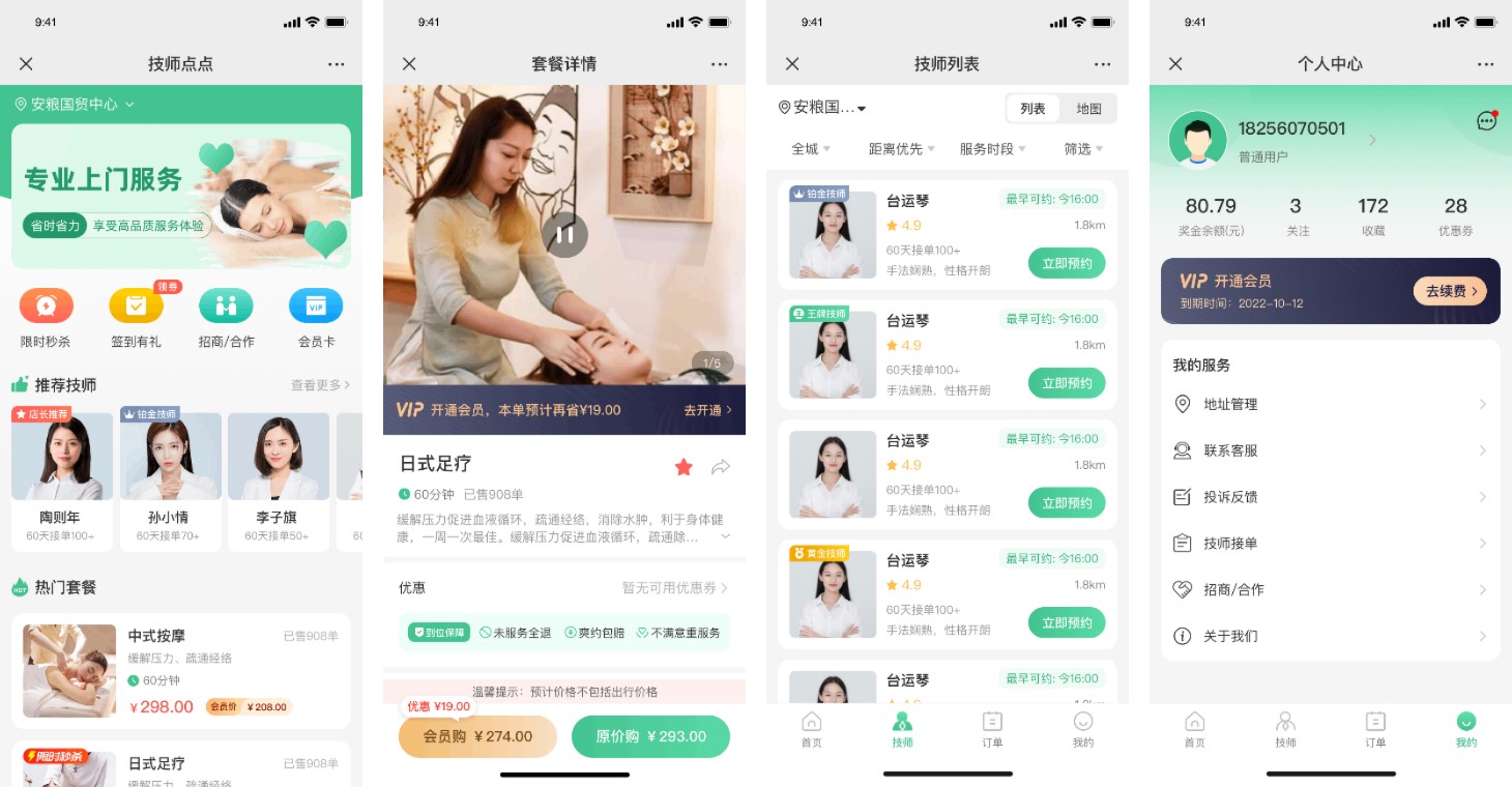 - 用户端:位置授权、服务品类筛选、技师选择(可查看资质、评分、评价)、在线预约(选择时间、地址)、在线支付、订单跟踪、评价反馈、优惠券使用、会员中心;