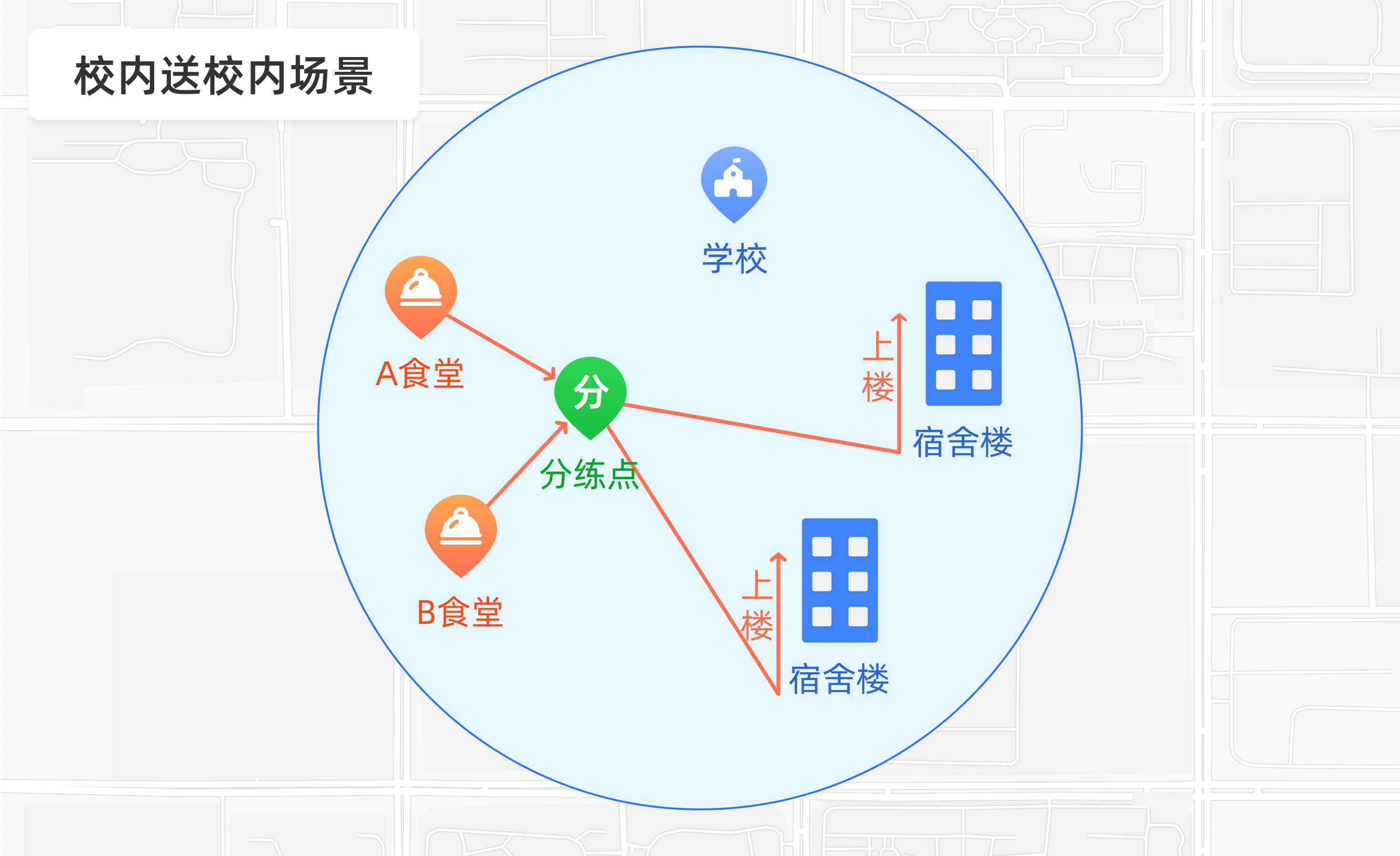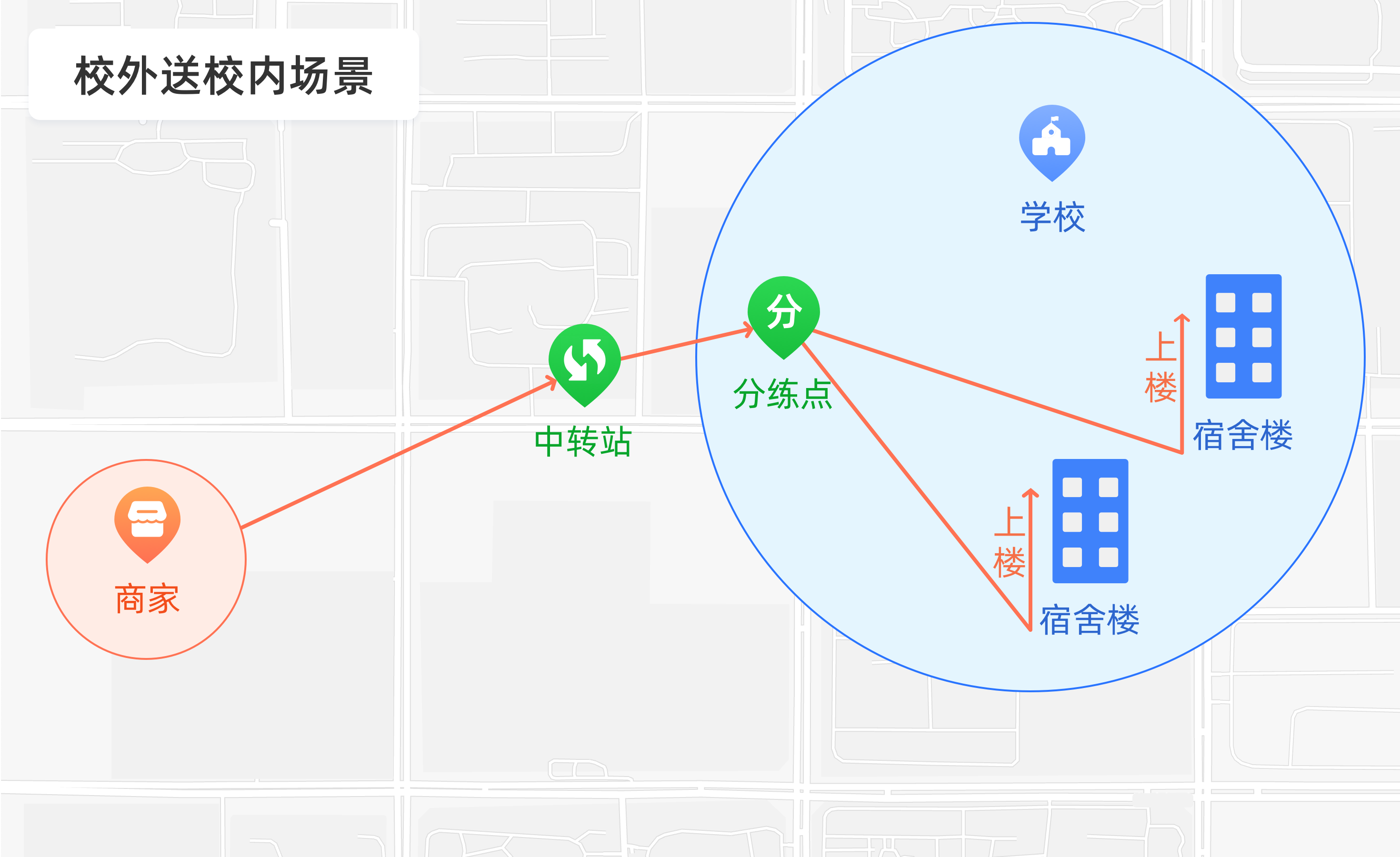 建议采用“分段式配送”模式:校外订单先由商家送到校园指定中转点,再由校内配送员分拣后批量配送至各楼栋;校内订单则直接在校内中转点分拣,快速配送到位。